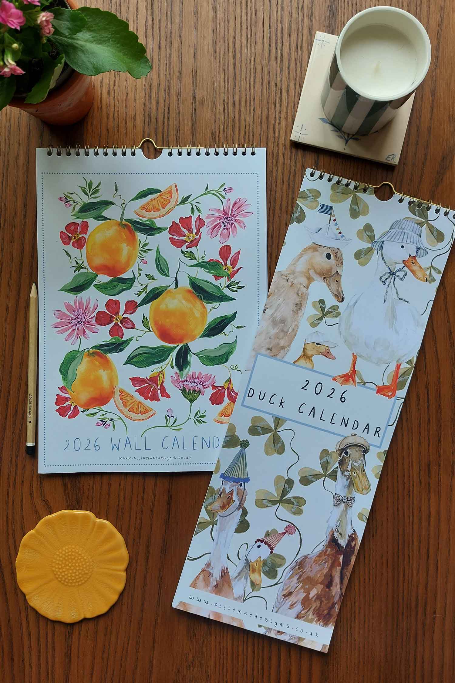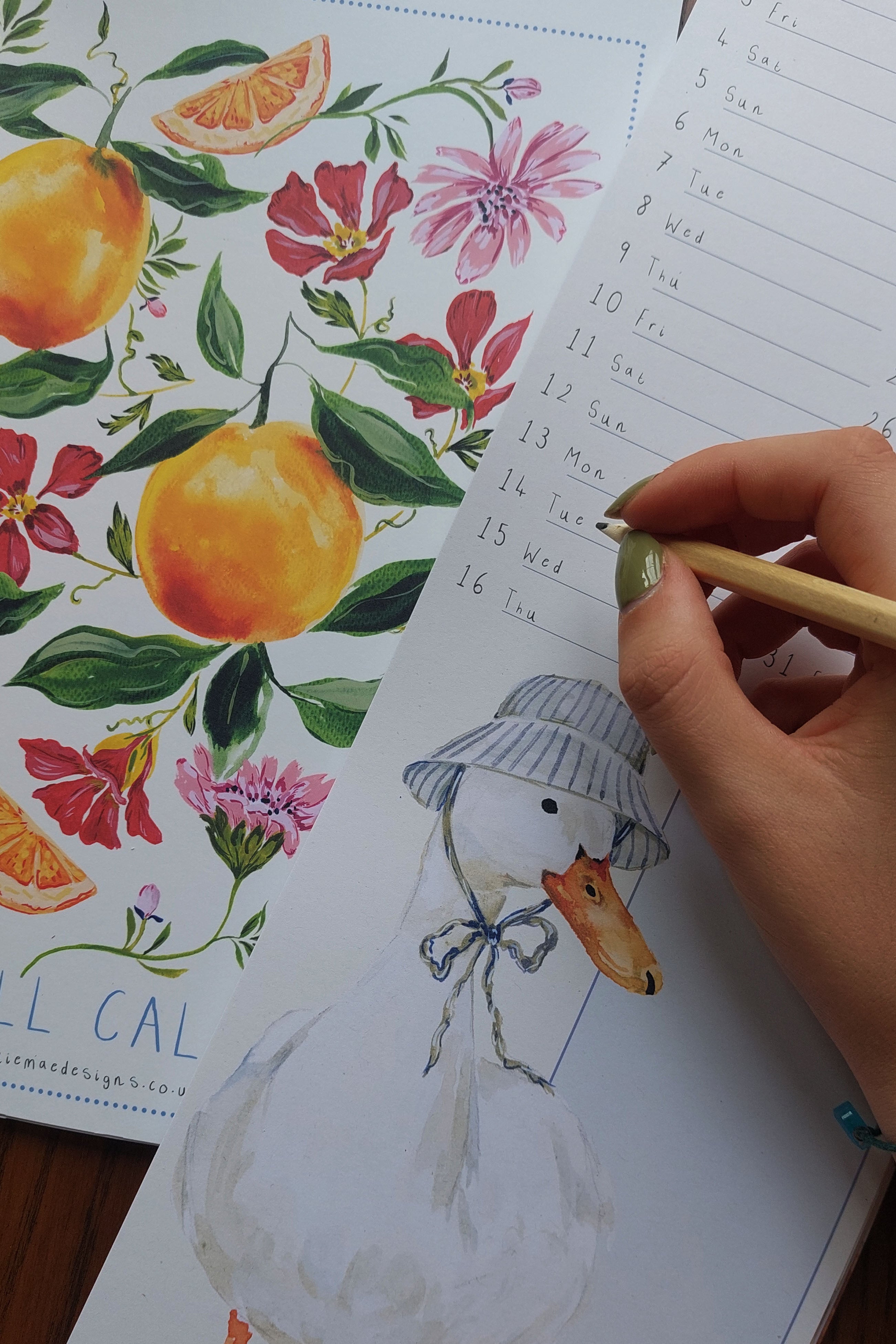 Step into a world of colour and whimsy with these hand-painted designs by Ellie Mae, taken from her Fruit Fine Art Collection. Each month features a whimsical duck wearing a distinguished accessory and a notes section for all your important information.